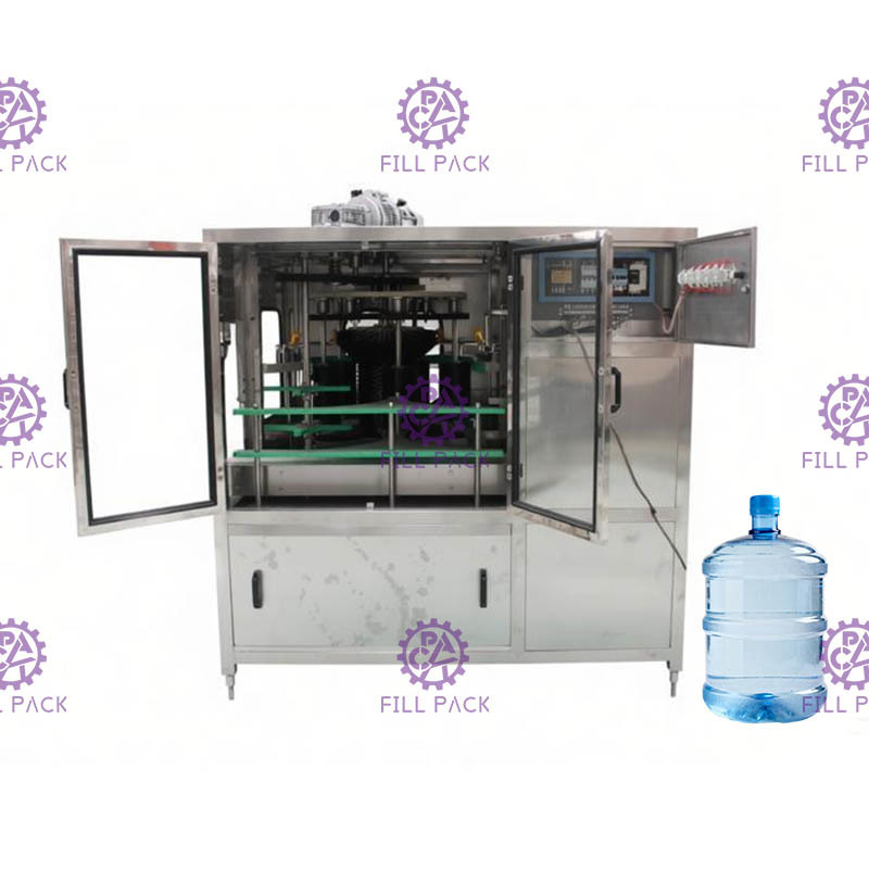 기계는 누수를 막기 위해 완전히 차단됩니다. 갤런 병이 세척 위치로 보내지면 실린더가 내부에 3개의 병을 멈추고 브러시와 고정 막대로 고정하고 물이 펌핑되어 병 본체로 분사되고 병이 브러시와 함께 회전합니다. 병은 브러시와 물 기능으로 청소됩니다.